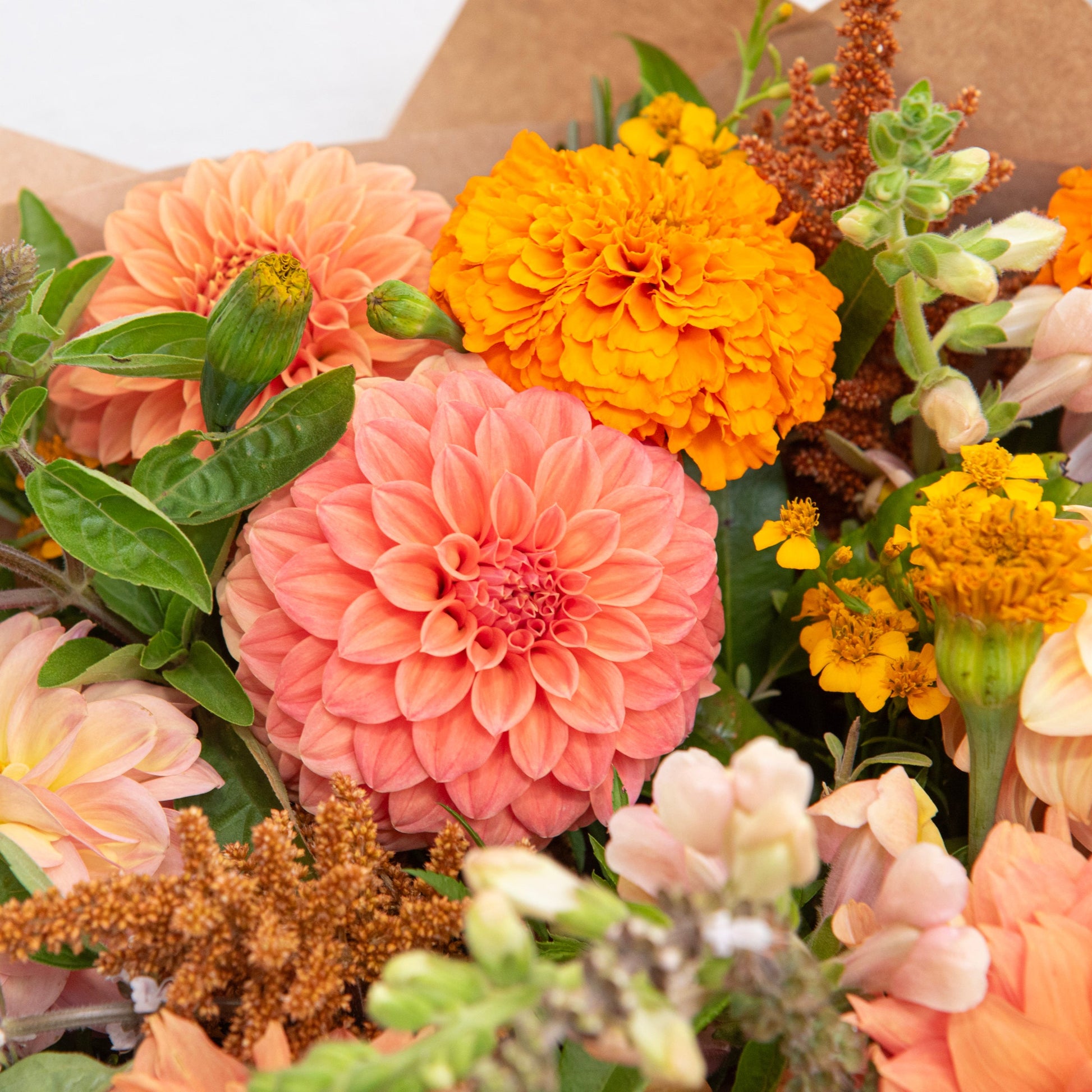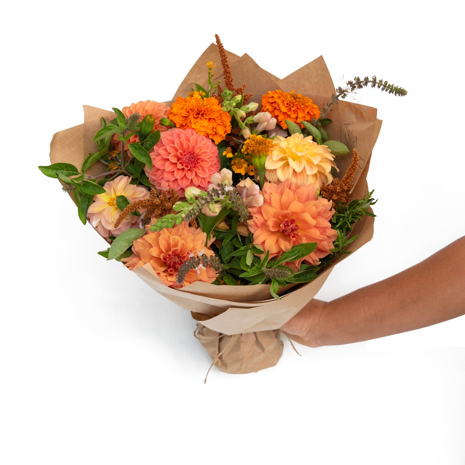 A beautiful seasonal bouquet of tangerine, orange and lemon, presented in our signature wrapping. The image shown is an indication of the signature Poppy & Fern style.