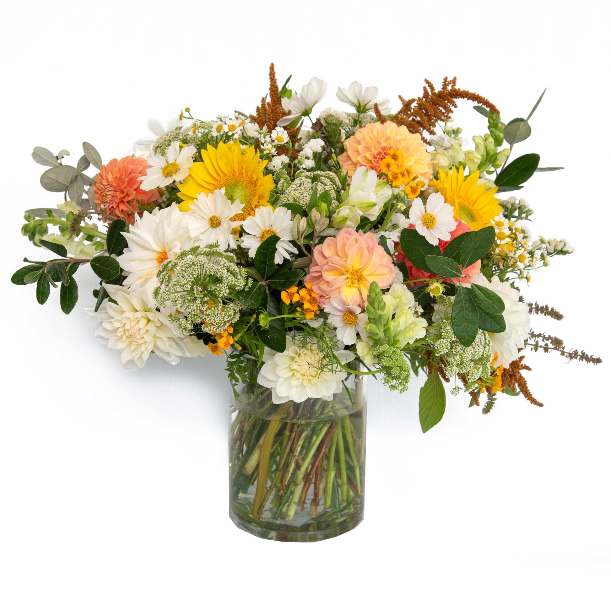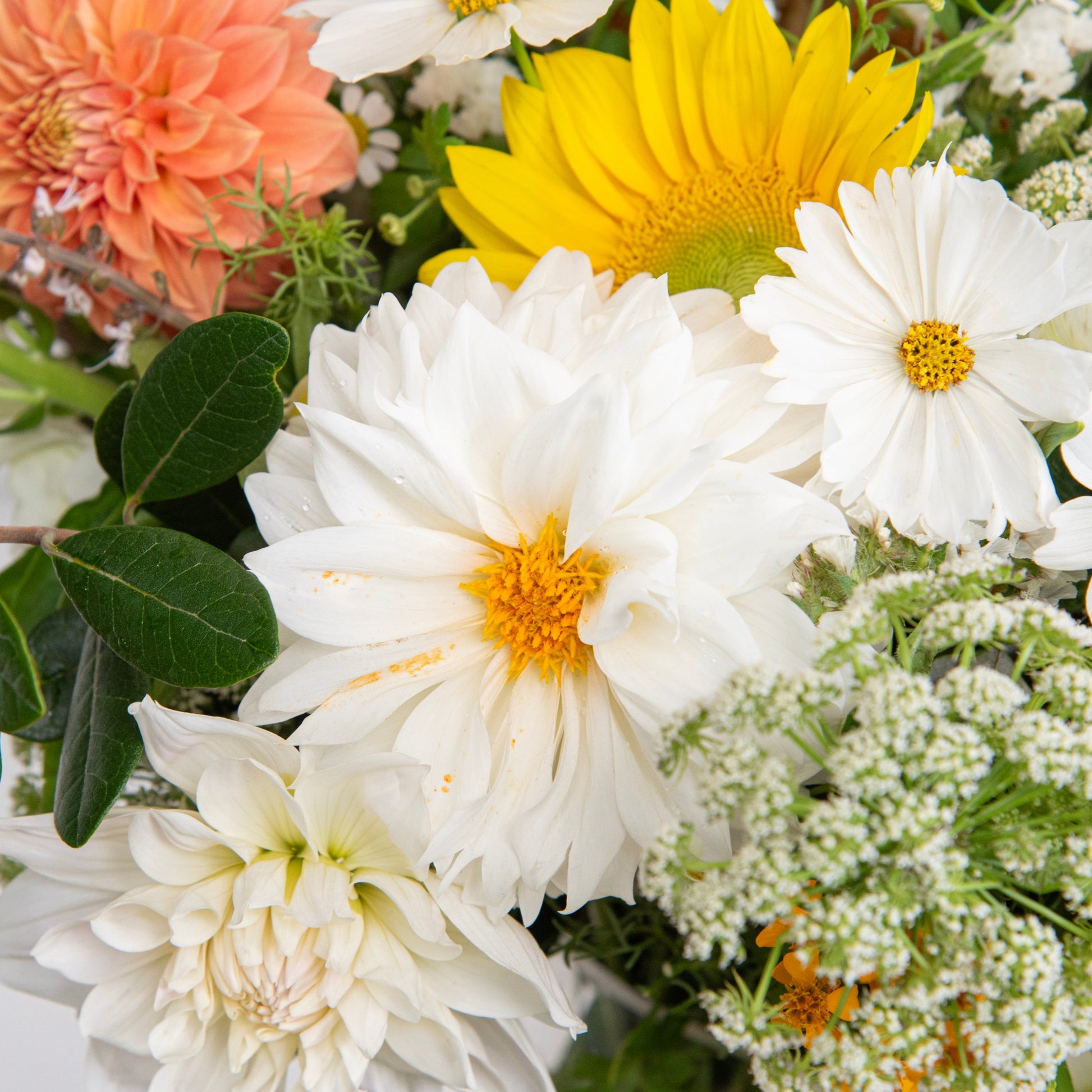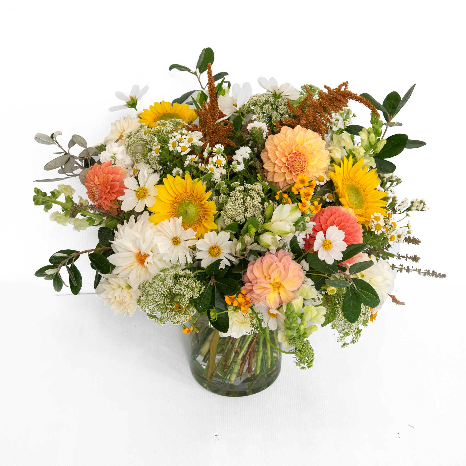 Beautiful seasonal vase arrangement of white, tangerine, lemon and orange blooms. Hand arranged and presented in a glass vase with our signature twine finish.