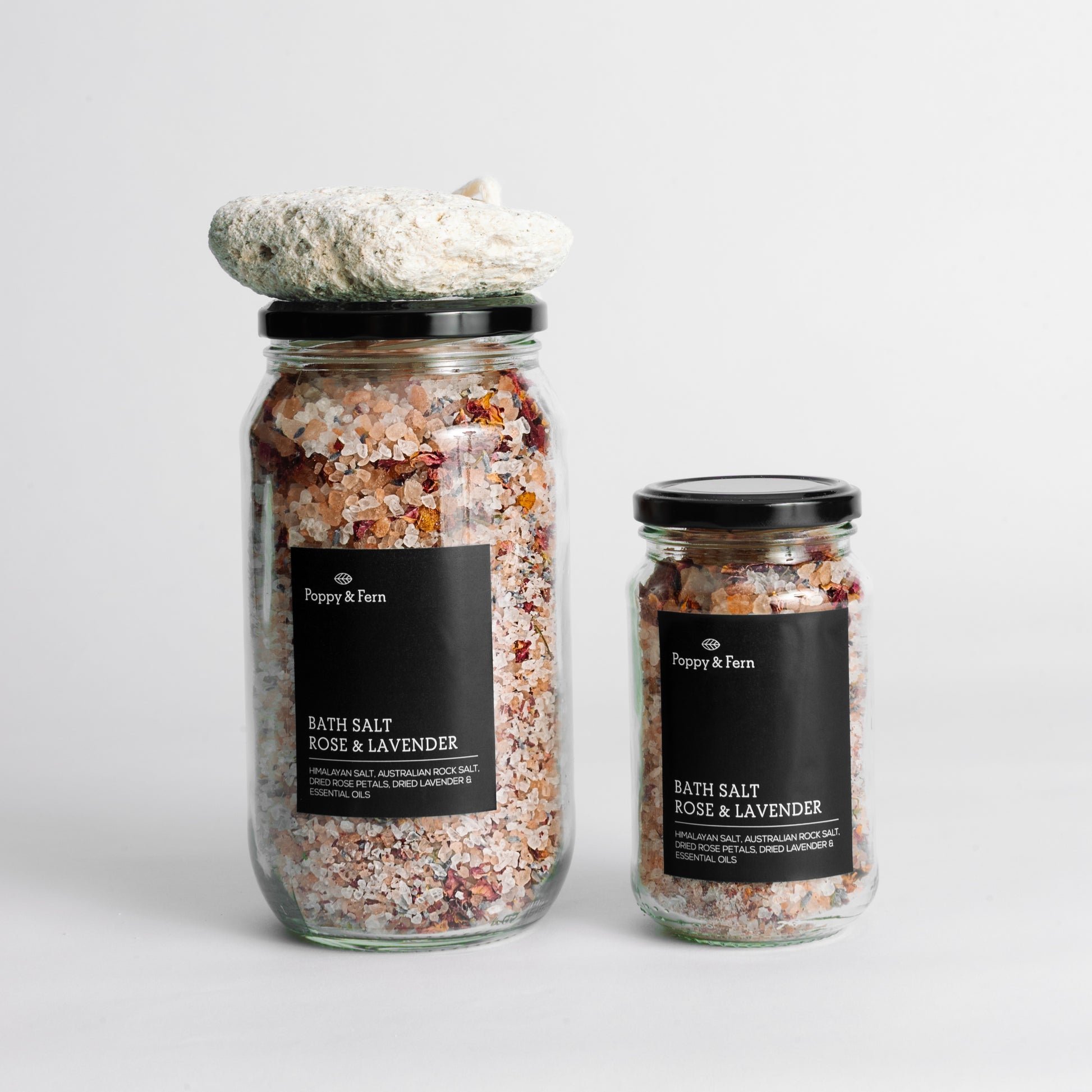 Handmade botanical bath salts, blended by us with love and care. Each jar is filled with a nourishing mix of Himalayan salt and Australian rock salt, finished with dried petals and pure essential oils. a simple ritual for rest and renewal.
