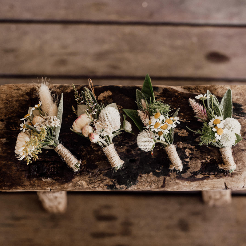 Each buttonhole is hand-crafted using a mix of seasonal florals and textures, finished with natural rope to create a laid-back, relaxed vibe.