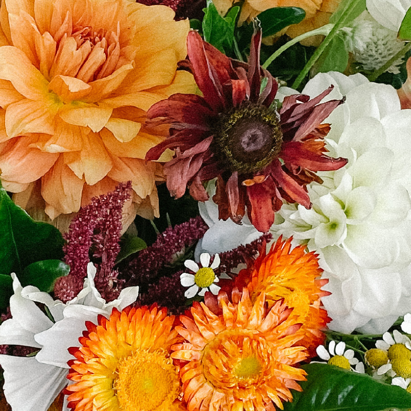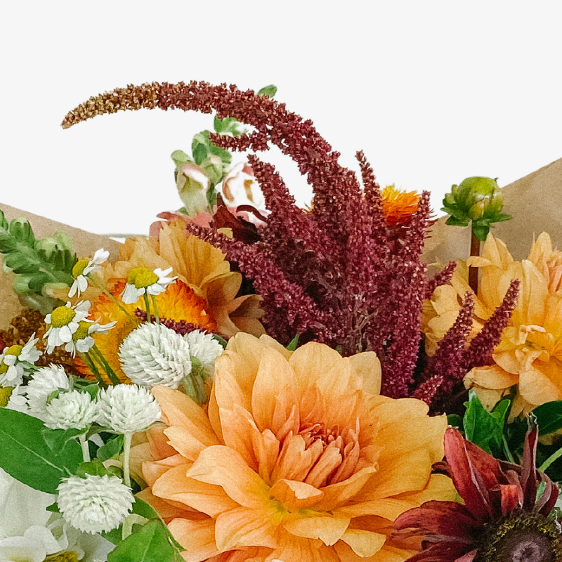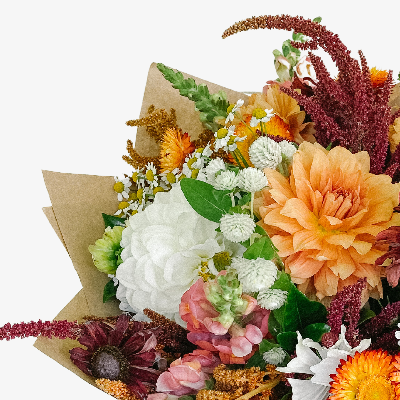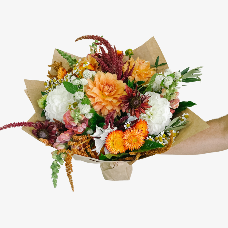 A beautiful seasonal bouquet of tangerine, white and burgundy tones, presented in our signature wrapping. The image shown is an indication of the signature Poppy & Fern style.