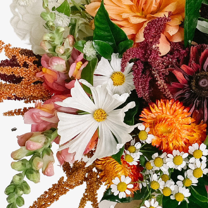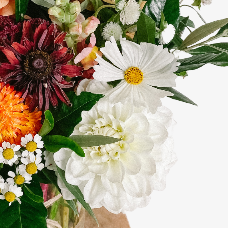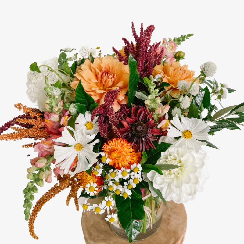 Beautiful seasonal vase arrangement of tangerine, white and bugundy blooms. Hand arranged and presented in a glass vase with our signature twine finish.