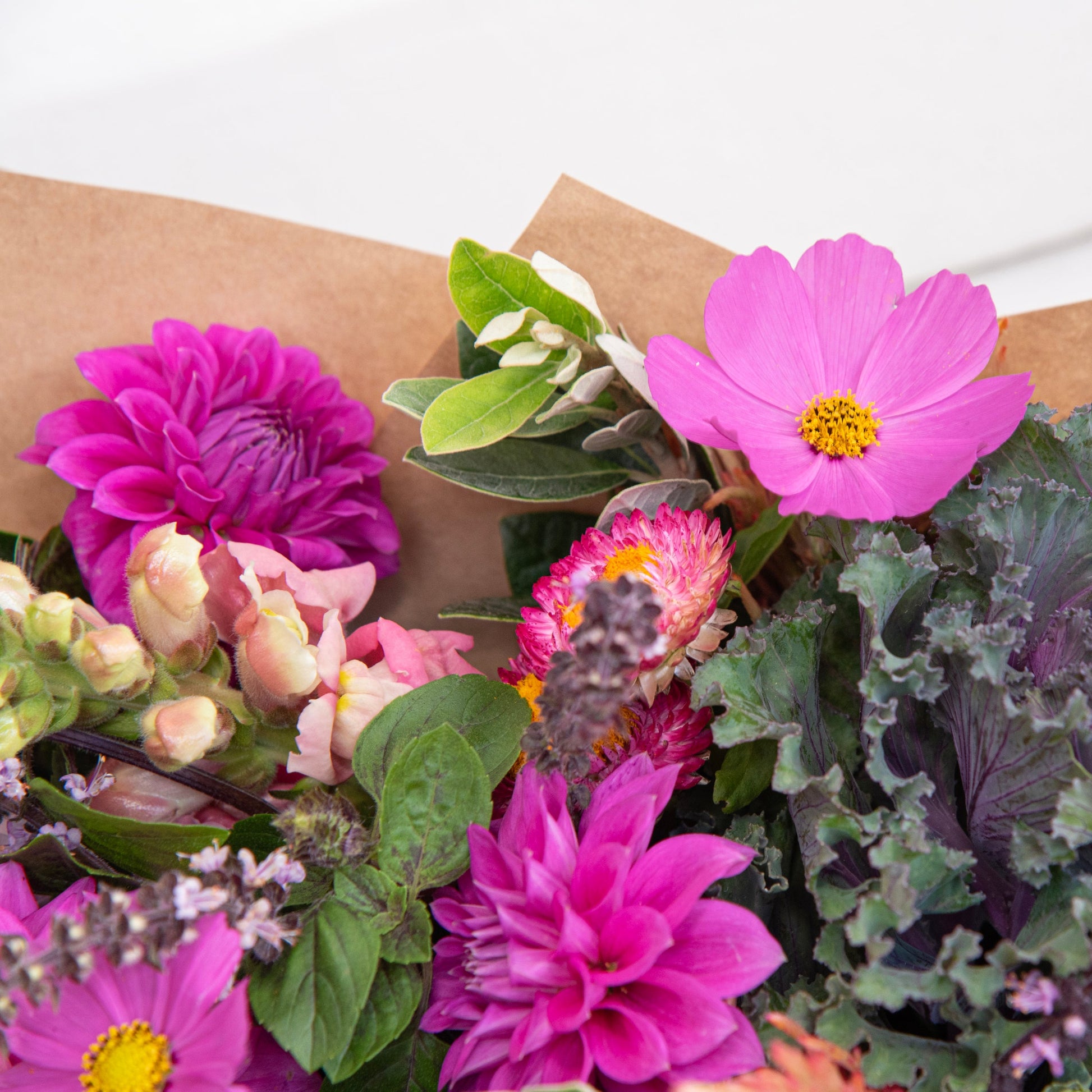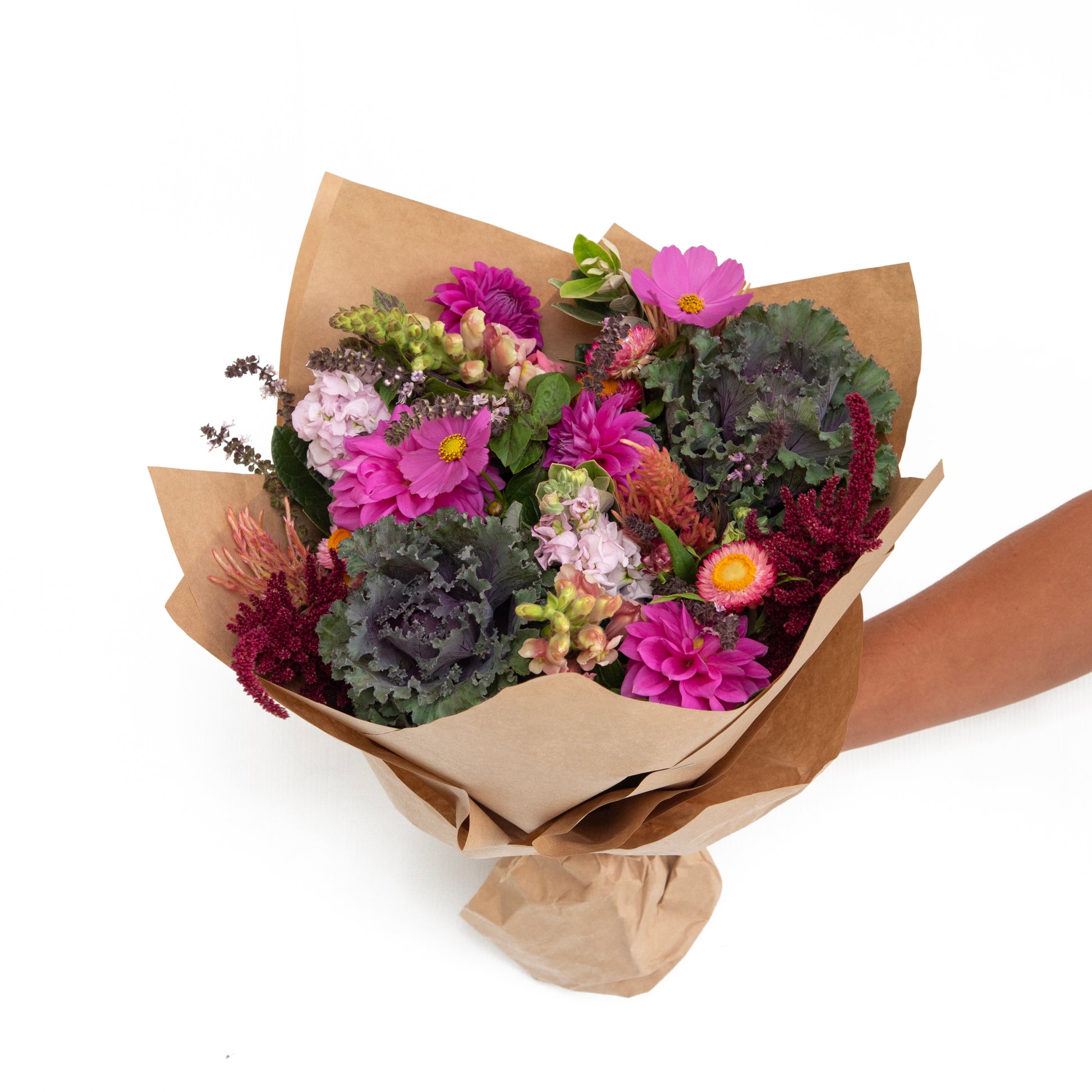 A beautiful seasonal bouquet of blush, pinks and mauves, presented in our signature wrapping. The image shown is an indication of the signature Poppy & Fern style.