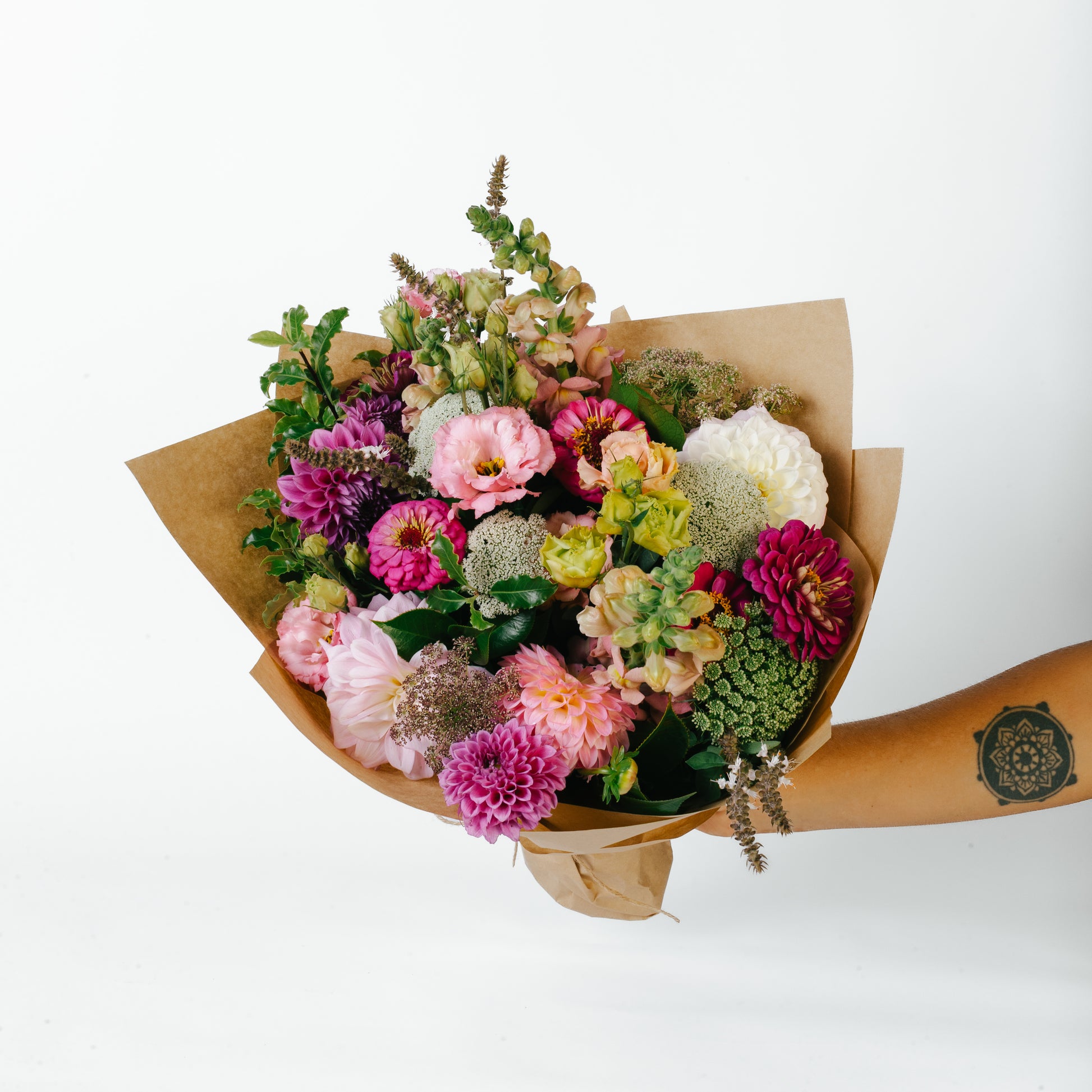 A lush, seasonal bouquet in soft blush, pink and mauve tones, thoughtfully wrapped in our signature Poppy & Fern brown paper and natural twine. Designed with movement and texture in mind, each bouquet celebrates the beauty of flowers as they are right now.