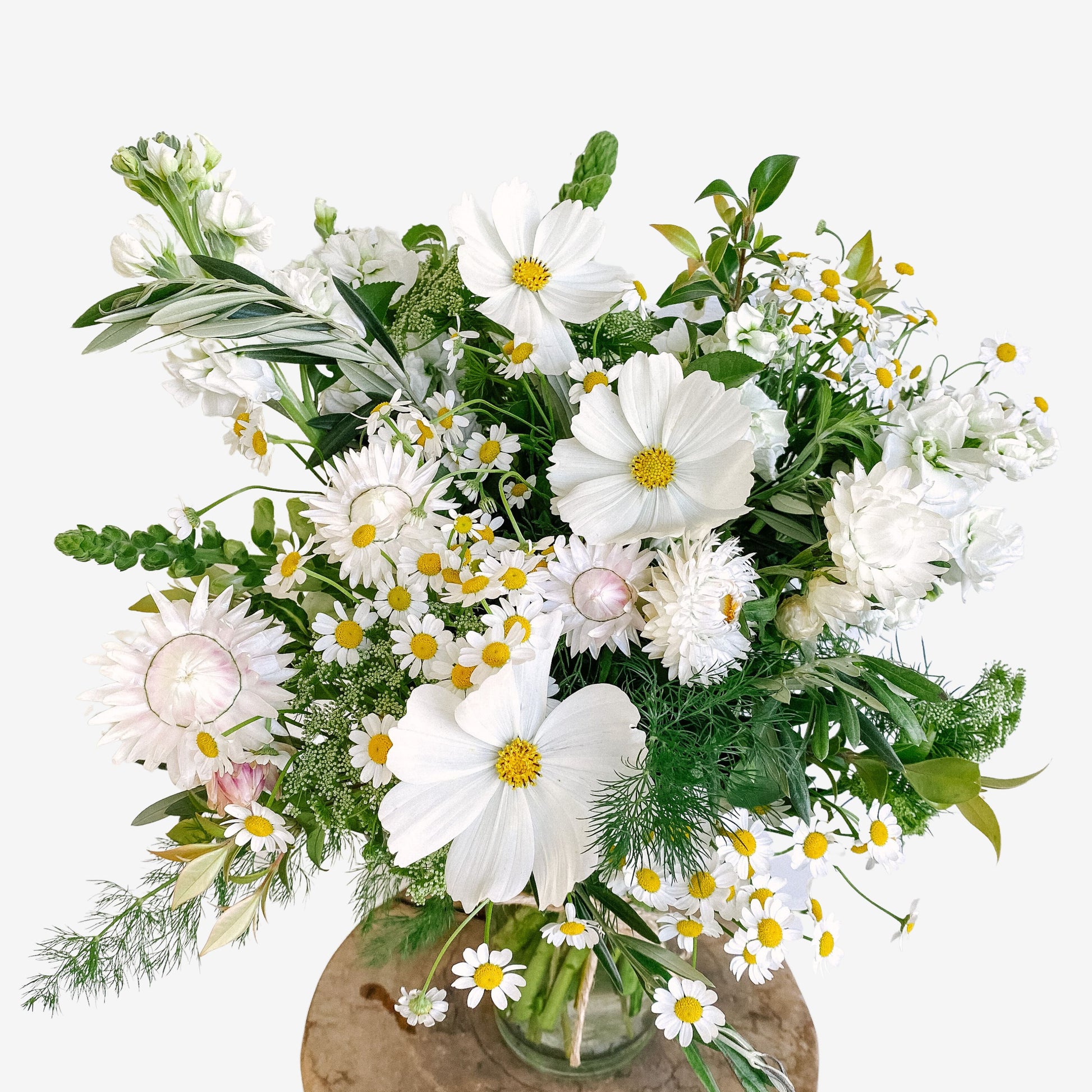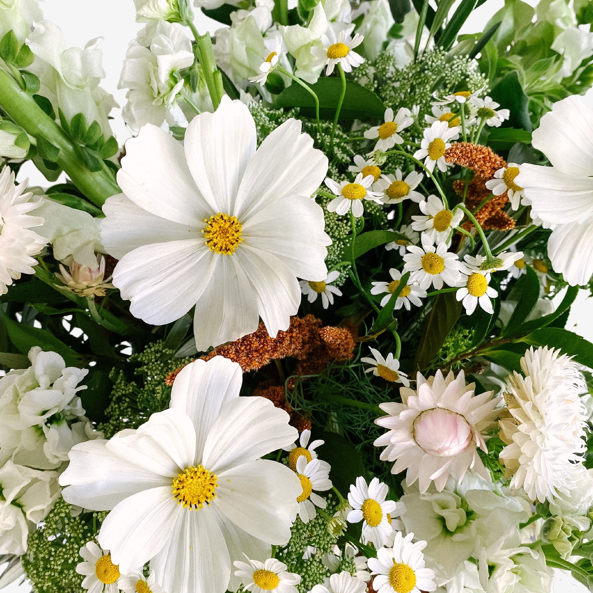 Beautiful seasonal vase arrangement of creams, white and neutral blooms. Hand arranged and presented in a glass vase with our signature twine finish.